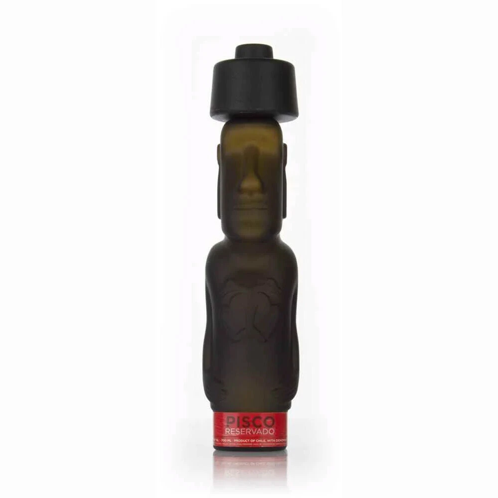 A beautifully bottled Reservado Pisco from Capel in Chile. After maturing in American oak barrels, the traditional grape brandy has been put into bottles shaped like the Moai statues on Easter Island.